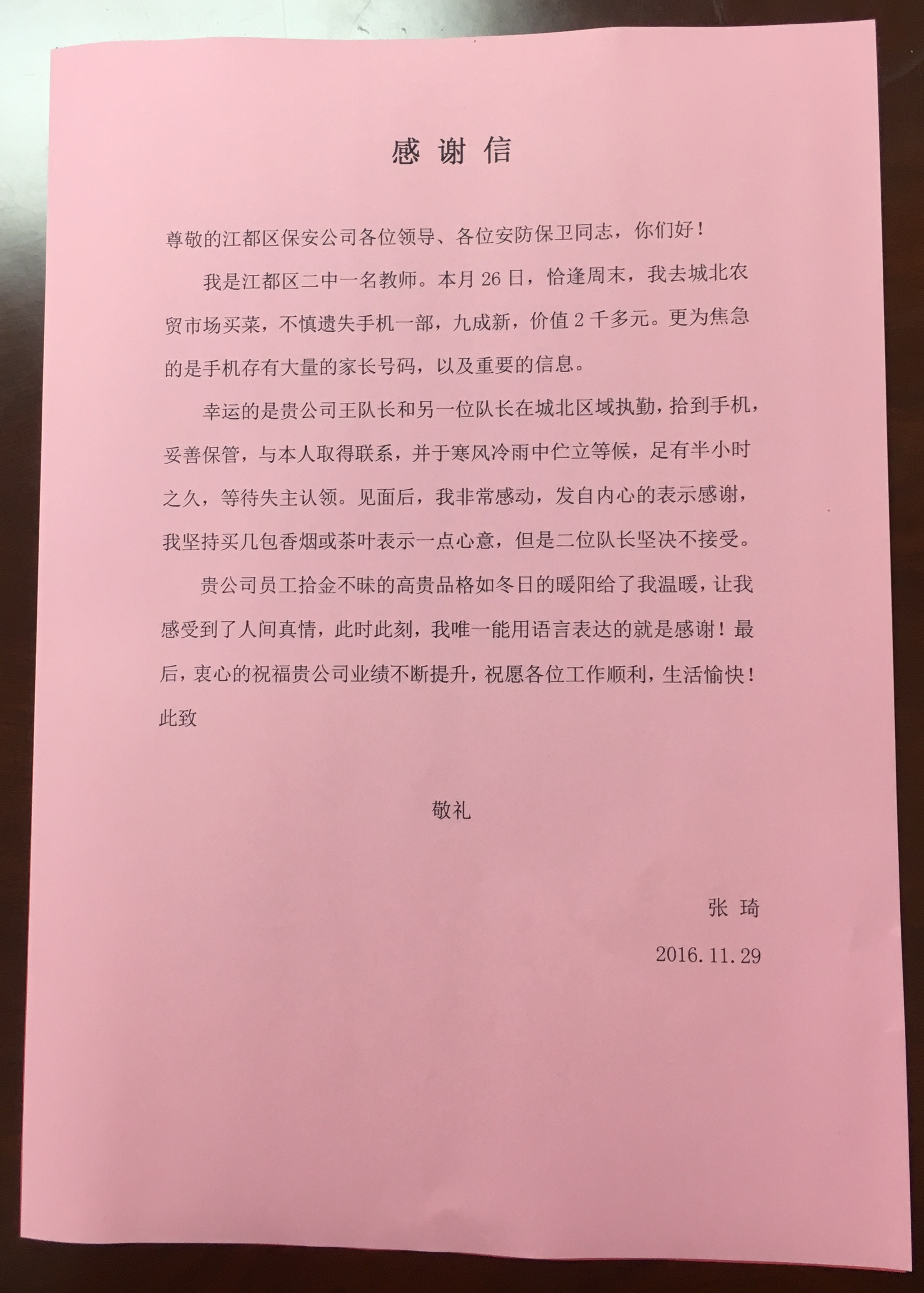 2016年11月29日下午,张琦先生将感谢信送到了扬州市江都区保安服务公司的相关领导手中,为表谢意!
