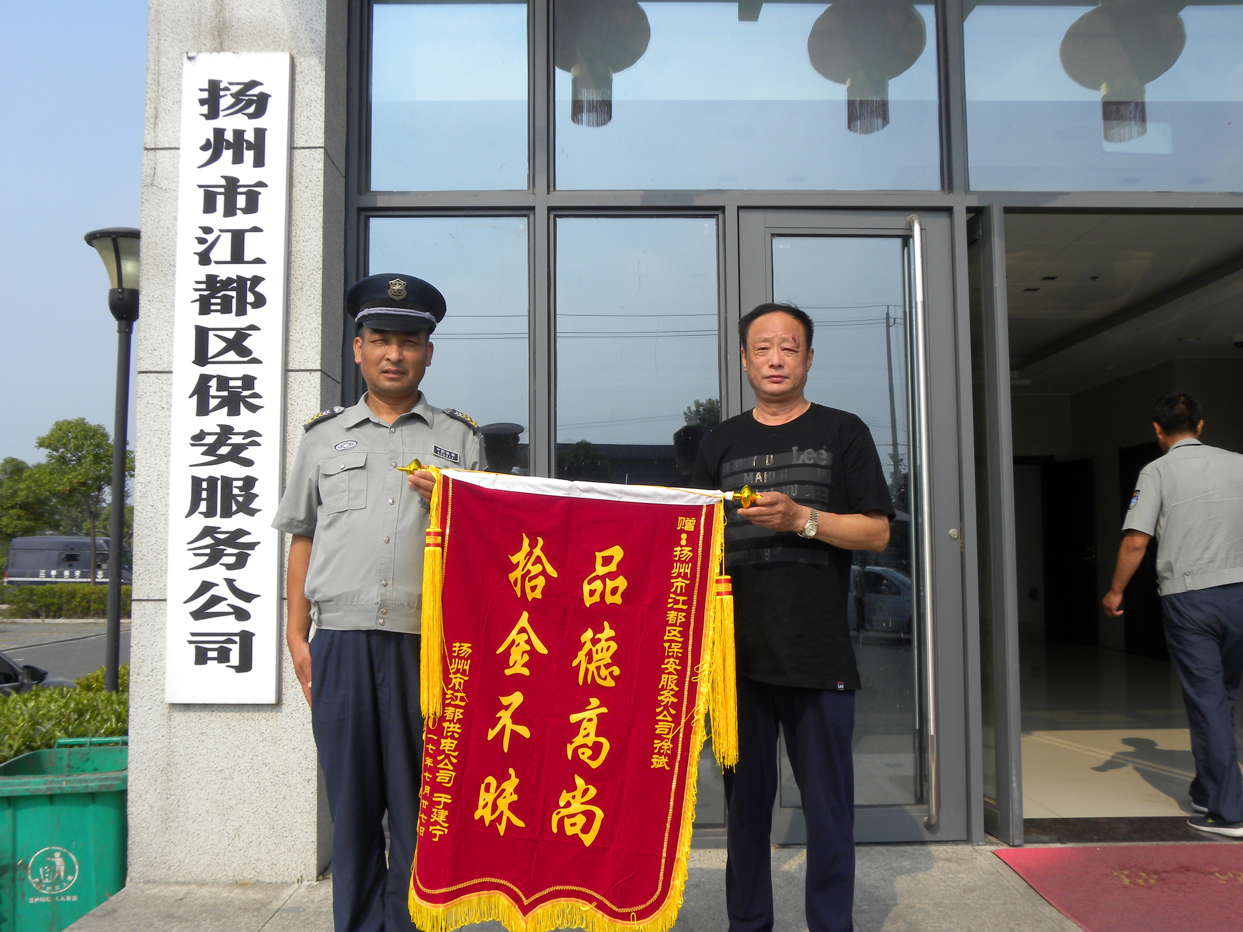 2017年9月4日下午四时左右,失主孙刚带着印有“拾金不昧”的锦旗来到了公司,并将锦旗亲手交到了蒋孝明手中,以表谢意!而蒋孝明也将自己捡到的手包亲手交还给了失主孙刚。失主孙刚表示,身边好人凝聚社会正能量,蒋孝明同志用自己拾金不昧的实际行动展现了扬州市江都区保安服务公司保安员优秀的个人品质,虽然这是一件小事,但他的高尚品德为我们传播了精神文明的“正能量”。