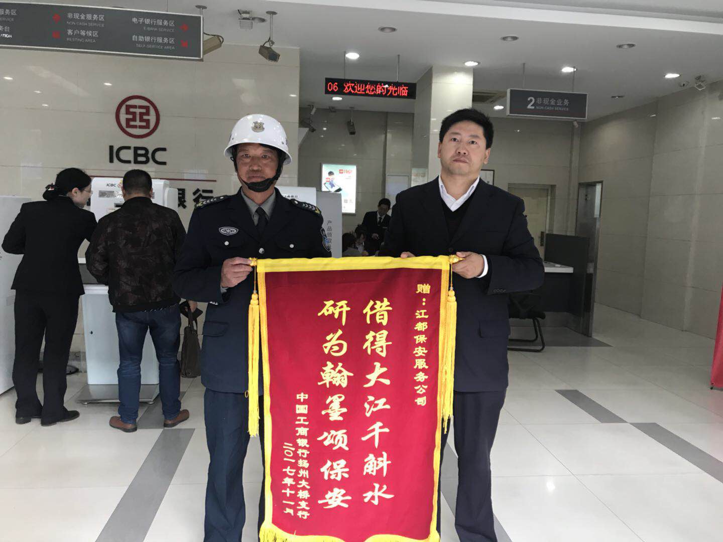 11月6日,中国工商银行大桥支行的相关负责人将印有“借得大江千斛水,研为翰墨颂保安”的锦旗送到了沈泽洋的手中,赞颂他是个有责任心的好保安!