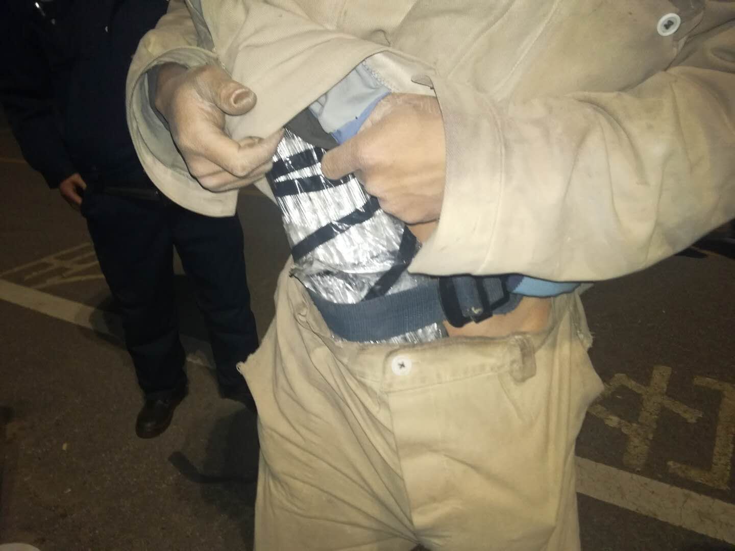 2017年12月22日21时,扬州市江都区保安服务公司人防二大队驻扬州中远海运重工有限公司保安员在对进出厂人员例行检查时,发现一男子形迹可疑,鬼鬼祟祟。保安员孙振立即上前对该男子进行盘查,细心的孙振发现此人身形极其不协调,上身臃肿且行动迟缓。于是在询问无果后,根据以往经验立即要求其脱掉外套,在该男子脱掉外套后,惊人的发现该男子身上绑满了去皮的铜电缆,于是保安员孙振立即协同其他保安队员将该男子予以控制,并将情况及向大队长报告。