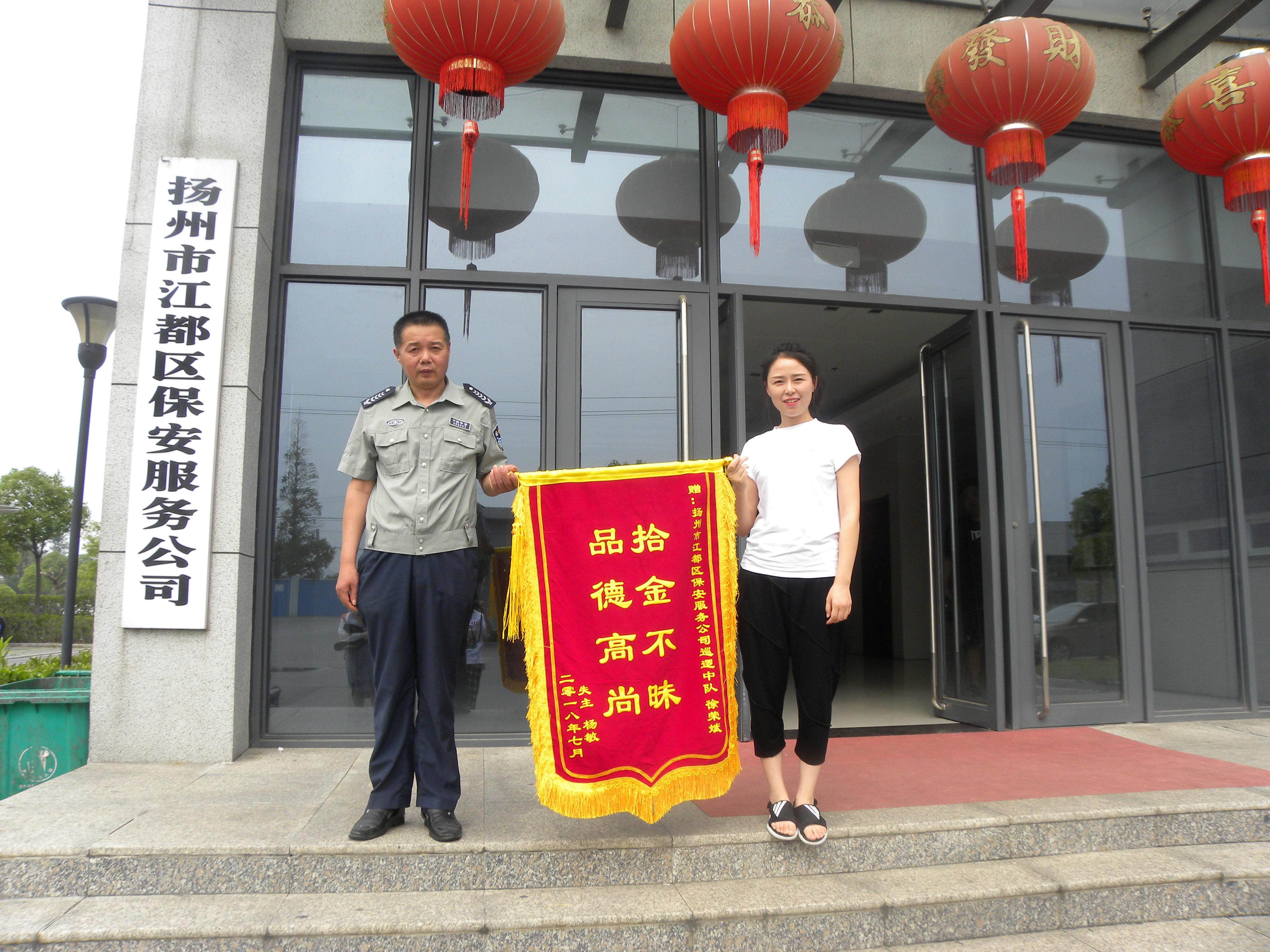 7月4日下午,失主杨敏带着锦旗来带了扬州市江都区保安公司,亲手将锦旗交到了保安员徐荣兵手上。失主杨敏表示“其实回去找的时候,我基本没抱什么希望,自助银行来来往往很多人,我想肯定早就被拿走了。我的包里虽然没有现金,但是身份证、银行卡、医保卡等都在里面,如果要补办很麻烦。真的没想到,你们公司的保安员真的让我特别感动,以后也要向他们学习,急人之所急,传递正能量。”