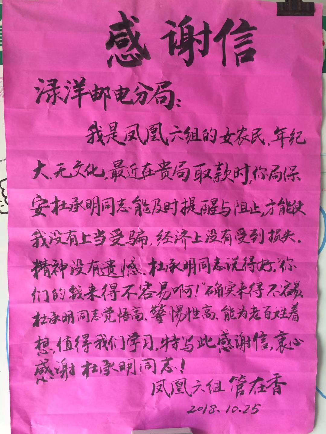 2018年10月26日上午,老太太再次来到了邮政储蓄渌洋支局找到了杜承明,亲手将托人写的感谢信交到了杜承明的手中,并握着杜承明的手连声感谢。原来老太太昨天回去后,便让家里人联系自己的侄子,才知道侄子根本没有托人打电话来借款,管老太这才意识到自己遇到了骗子。