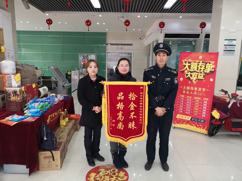 元月19日,在经过一天一夜的排查,终于通过视频监控找到了失主孙燕。在和支行网点工作人员一起核实情况后,主动联系失主,经确认归还了金手镯。元月20日上午9:00左右,失主孙燕来到支行网点亲手将“拾金不昧、品格高尚”的锦旗送到保安员崔孝钢的手中,并称赞崔孝钢是个思想品德好,热心细致的好保安。