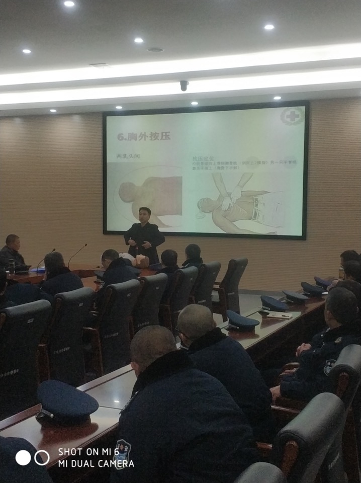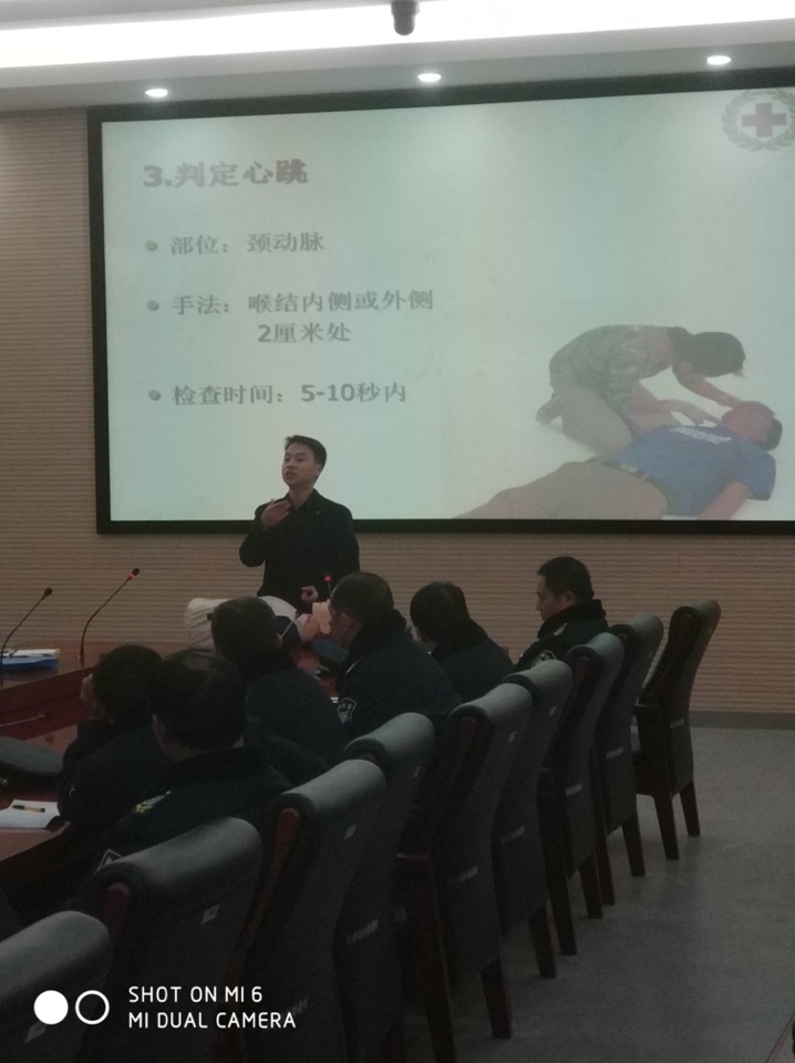 为了大力加强队伍素质建设,始终坚持以人为本理念,不断提高队员紧急情况应变能力和自身健康保护意识,2018年12月20日、21日晚上7时,公司人防一大队分别在扬州南水北调东线指挥部会议室和中国银行江都支行会议室,对全体一线队员“紧急救护与健康知识”专题培训。